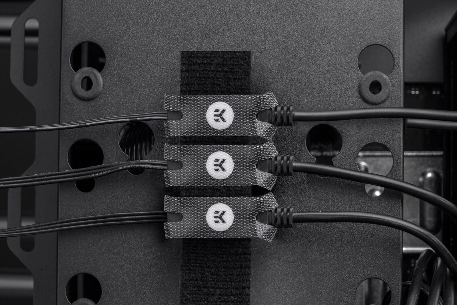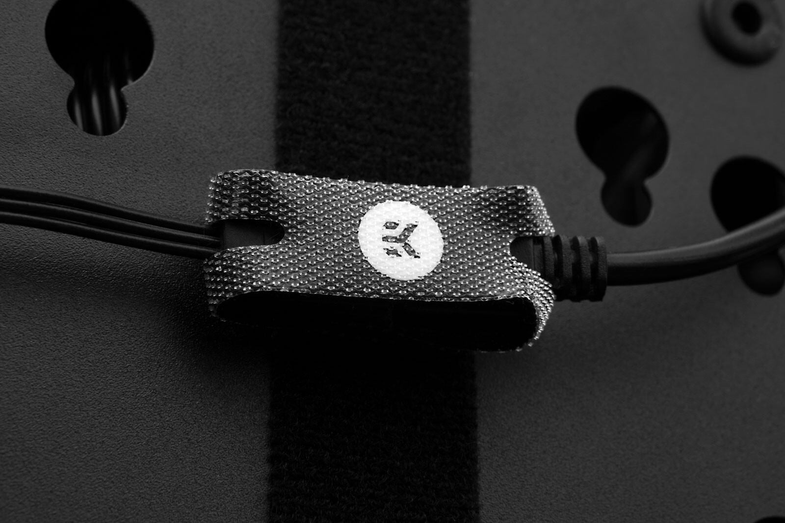 このスタイリッシュな面ファスナーは、両サイドのRGBコネクターの接続部分を包み込み、ストラップで固定します。両ケーブルをファスナーに通して接続し、最後にファスナーで接続部全体を縛ることで、ヘッダーが外れるのを防ぎます。これらの面ファスナーは黒で、中央には微妙なグレーのEKブランドがあり、ケーブルマネジメントシステムを設置すると見えるようになります。