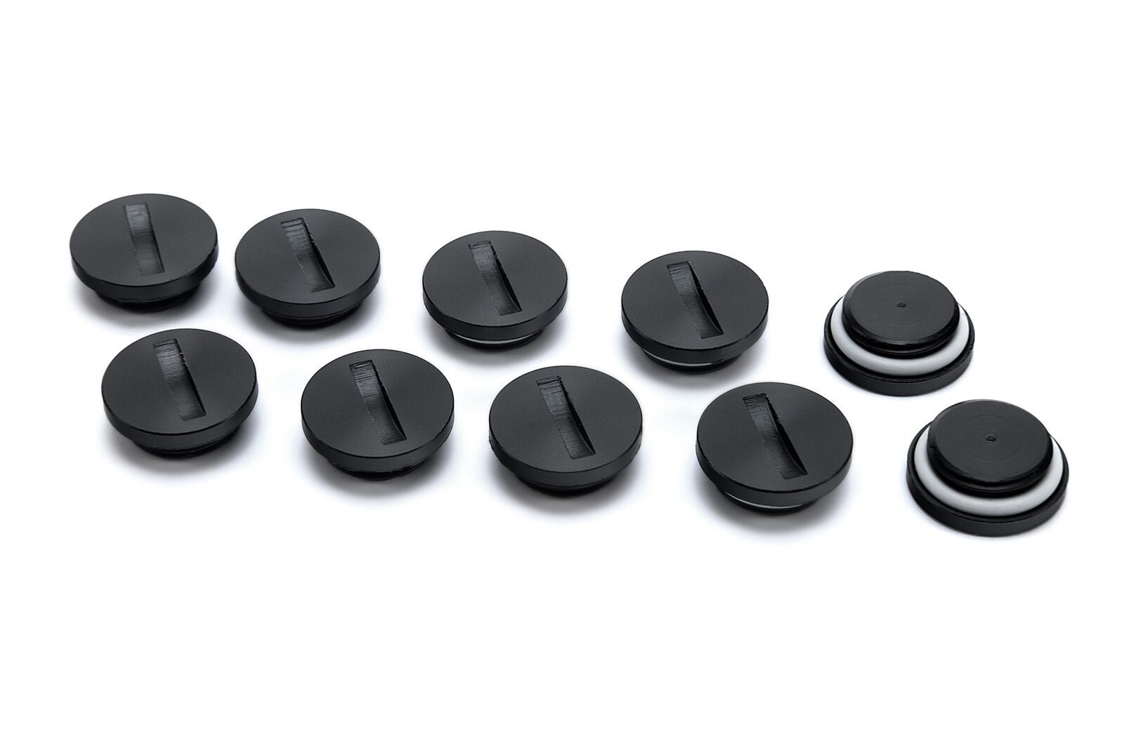 EK-PLUG G1/4 Acetal - Black(10Pack)は、黒のアセタール製G1/4インチプラグ(Oリング付き)10個のシンプルなパックです。プラグは1ユーロ硬貨などで簡単に締め付けることができます。長期保管する水冷ハードウエアのキャップに便利なプラグセットです。シンプルなアセタールプラグは、ホコリの侵入を防ぎ、気密性の高いプラグは、酸化を防ぐことができます。